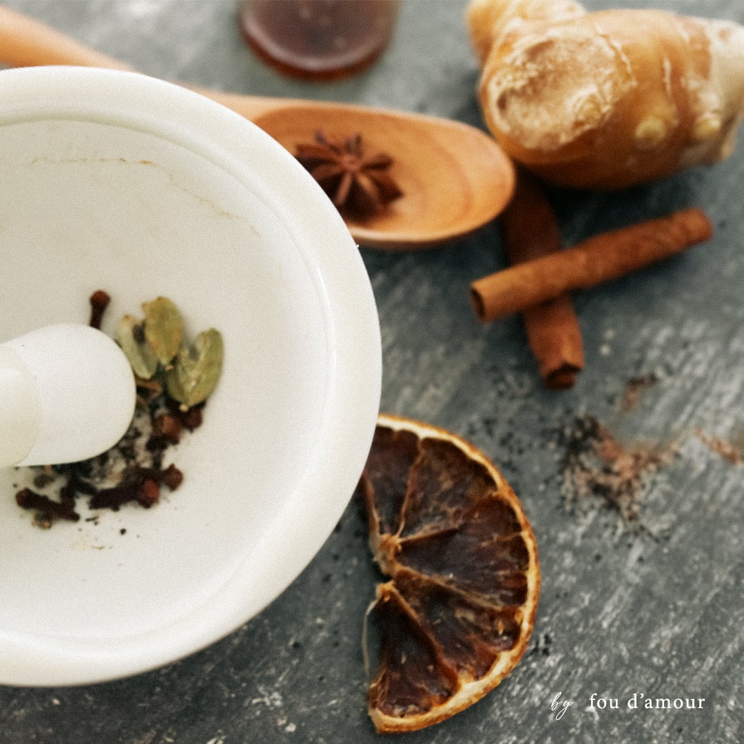 クローブ、カルダモン、ジンジャーなどの精油と高品質のフレグランスオイルを配合し
